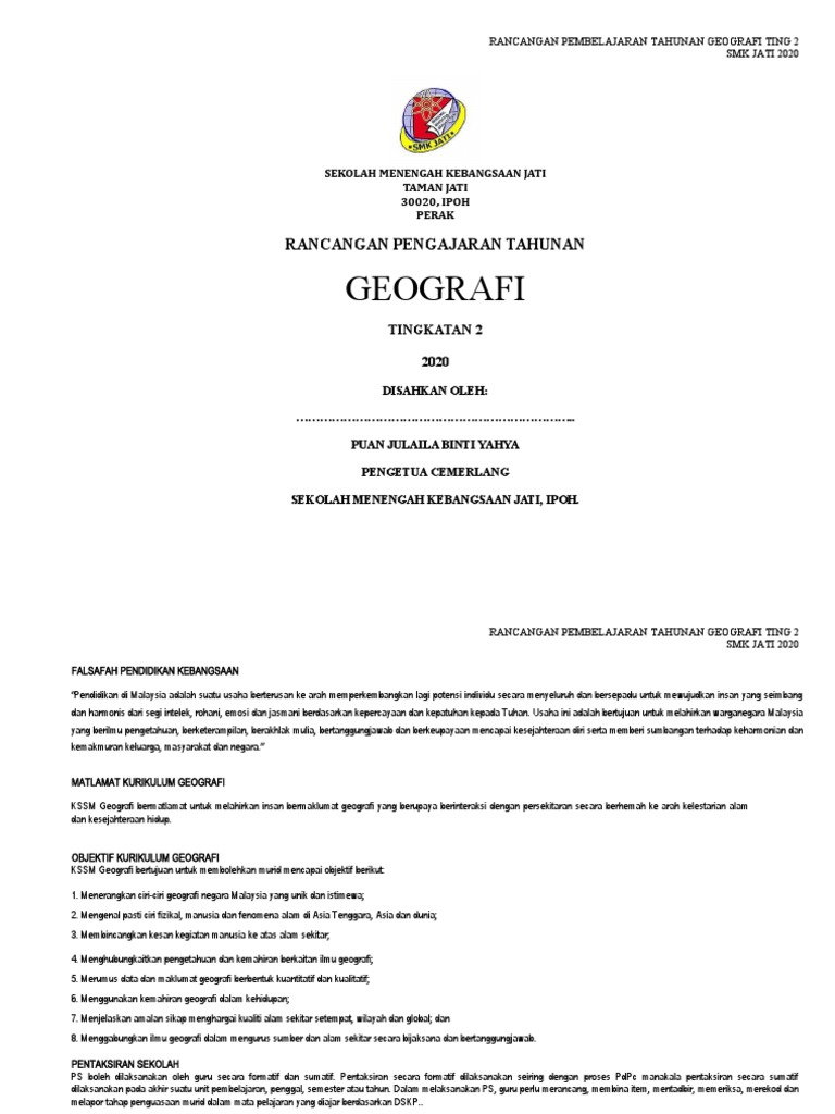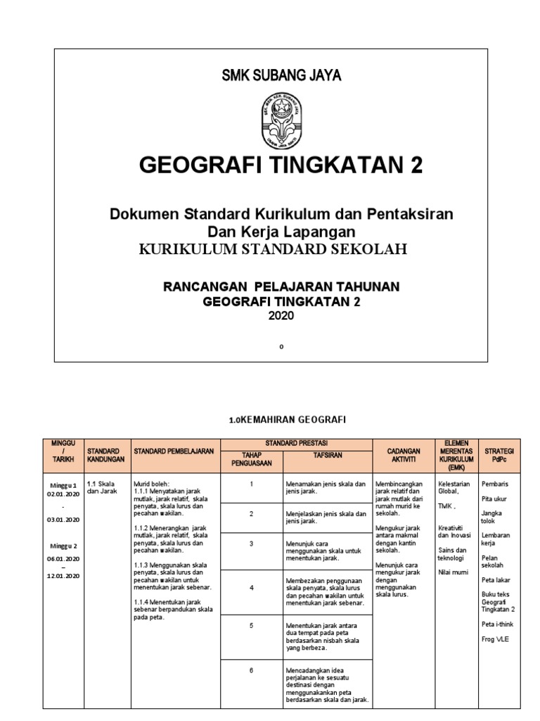 Rancangan Pengajaran Tahunan ini dibentuk berdasarkan Dokumen Standard Kurikulum dan Pentaksiran DSKP. Bahasa Inggeris English. View flipping ebook version of RPT GEOGRAFI 2020 PENJAJARAN TING 2 published by staff909 on 2020-12-16.